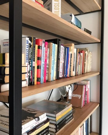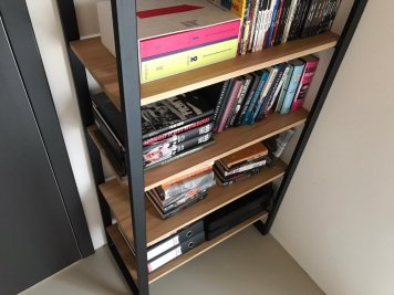 Obě knihovny měli shodnou výšku 2200 mm, šířku 1400 a 800 mm. U obou výrobků byly použity krásné masivní dubové desky. Každá dubová polička byla podpořena ze spodní strany kovovým plátem a únosnost celé konstrukce tak je skutečně vysoká. Zákazník mohl obě knihovny plně zarovnat knihami a nedošlo k žádnému prohybu.